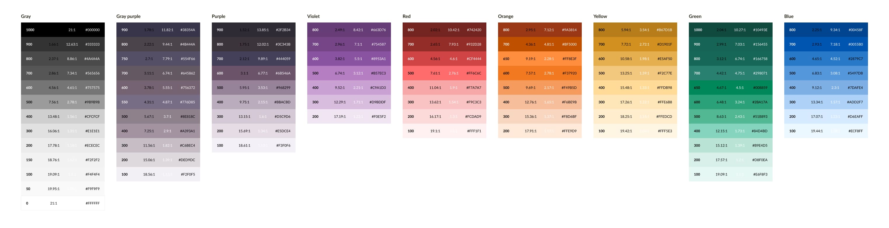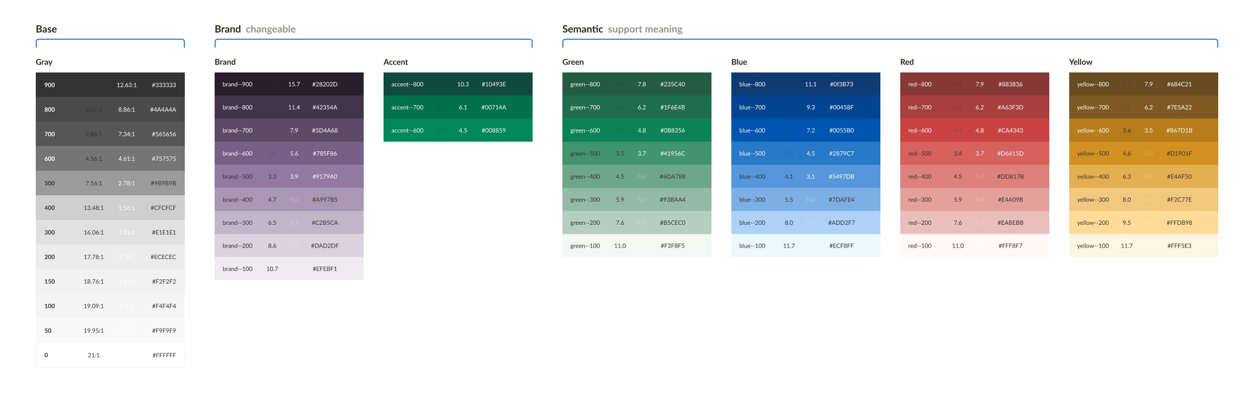 The original color palette had no structure or usage rules: dozens of similar purple shades, green used both as semantic and accent, and designers choosing colors visually with no clear logic.